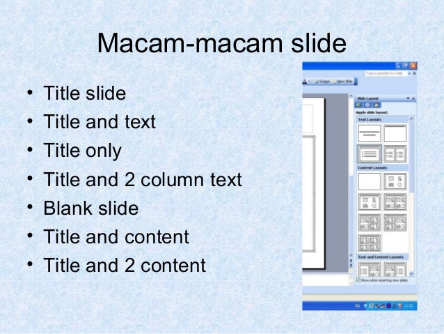 - 10. Macam-macam slide • • • • • • • Title slide Title and text Title only Title and 2 column text Blank slide Title and content Title and 2 content