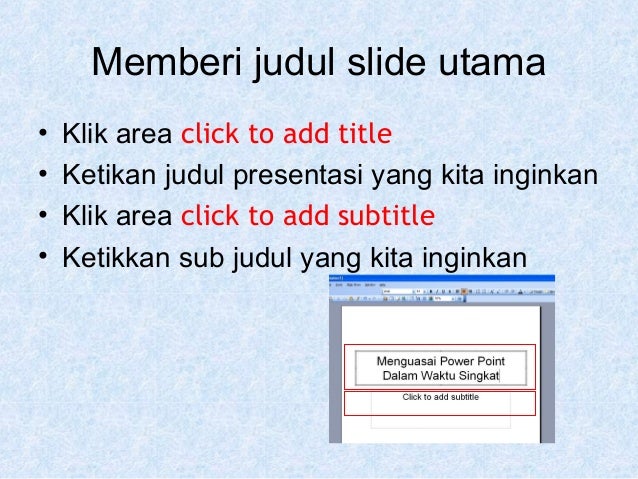 - 11. Memberi judul slide utama • • • • Klik area click to add title Ketikan judul presentasi yang kita inginkan Klik area click to add subtitle Ketikkan sub judul yang kita inginkan