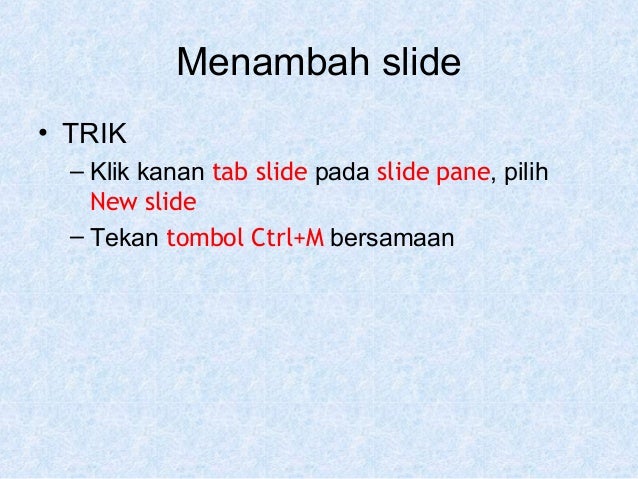 - 13. Menambah slide • TRIK – Klik kanan tab slide pada slide pane, pilih New slide – Tekan tombol Ctrl+M bersamaan