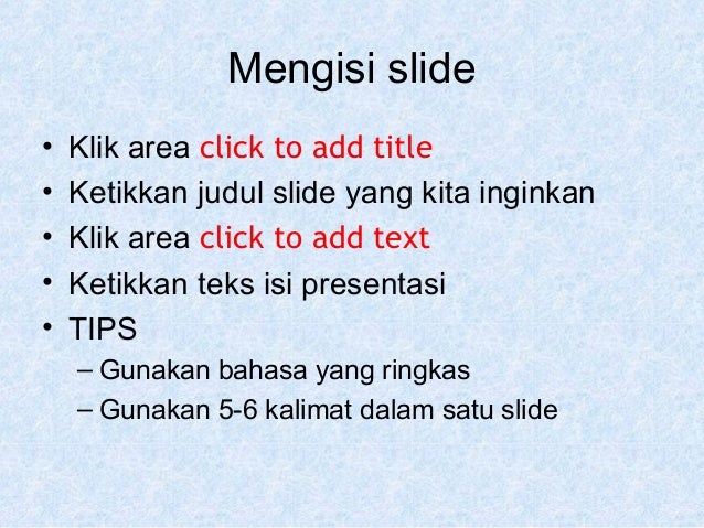 - 14. Mengisi slide • • • • • Klik area click to add title Ketikkan judul slide yang kita inginkan Klik area click to add text Ketikkan teks isi presentasi TIPS – Gunakan bahasa yang ringkas – Gunakan 5-6 kalimat dalam satu slide