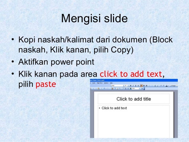 - 15. Mengisi slide • Kopi naskah/kalimat dari dokumen (Block naskah, Klik kanan, pilih Copy) • Aktifkan power point • Klik kanan pada area click to add text, pilih paste