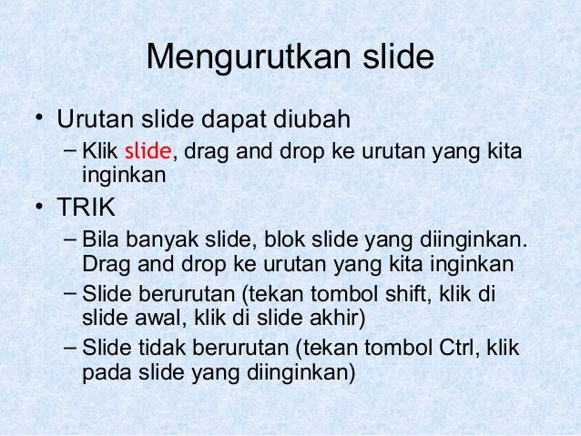 - 16. Mengurutkan slide • Urutan slide dapat diubah – Klik slide, drag and drop ke urutan yang kita inginkan • TRIK – Bila banyak slide, blok slide yang diinginkan. Drag and drop ke urutan yang kita inginkan – Slide berurutan (tekan tombol shift, klik di slide awal, klik di slide akhir) – Slide tidak berurutan (tekan tombol Ctrl, klik pada slide yang diinginkan)