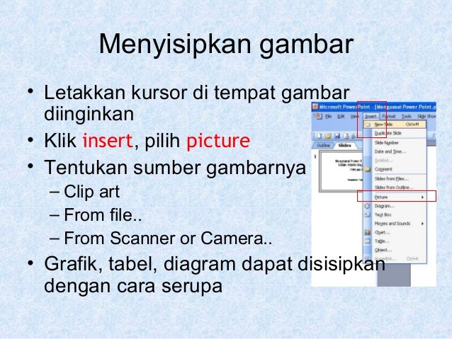 - 18. Menyisipkan gambar • Letakkan kursor di tempat gambar diinginkan • Klik insert, pilih picture • Tentukan sumber gambarnya – Clip art – From file.. – From Scanner or Camera.. • Grafik, tabel, diagram dapat disisipkan dengan cara serupa