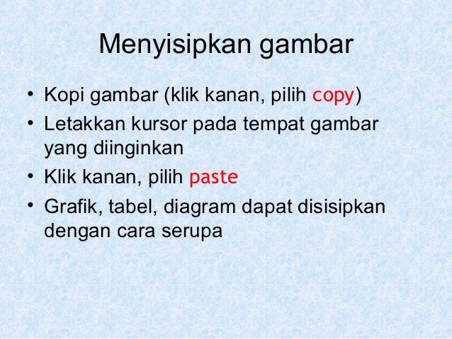 - 19. Menyisipkan gambar • Kopi gambar (klik kanan, pilih copy) • Letakkan kursor pada tempat gambar yang diinginkan • Klik kanan, pilih paste • Grafik, tabel, diagram dapat disisipkan dengan cara serupa