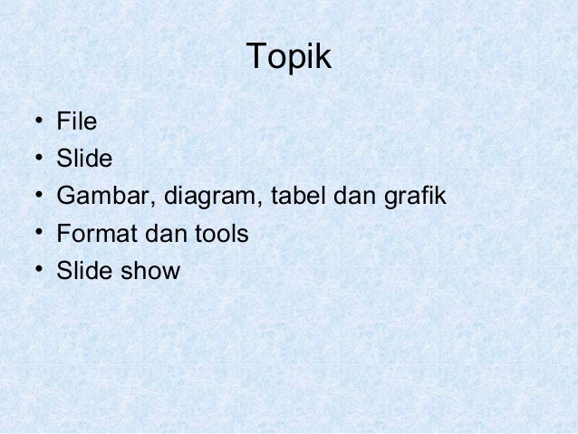 - 2. Topik • • • • • File Slide Gambar, diagram, tabel dan grafik Format dan tools Slide show
