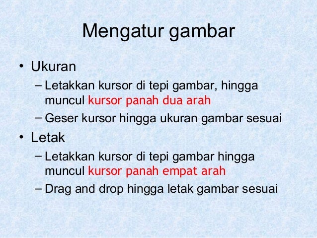 - 20. Mengatur gambar • Ukuran – Letakkan kursor di tepi gambar, hingga muncul kursor panah dua arah – Geser kursor hingga ukuran gambar sesuai • Letak – Letakkan kursor di tepi gambar hingga muncul kursor panah empat arah – Drag and drop hingga letak gambar sesuai