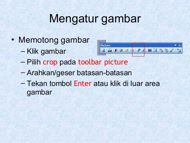 - 21. Mengatur gambar • Memotong gambar – Klik gambar – Pilih crop pada toolbar picture – Arahkan/geser batasan-batasan – Tekan tombol Enter atau klik di luar area gambar