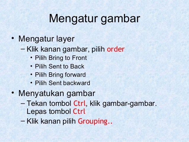 - 22. Mengatur gambar • Mengatur layer – Klik kanan gambar, pilih order • • • • Pilih Bring to Front Pilih Sent to Back Pilih Bring forward Pilih Sent backward • Menyatukan gambar – Tekan tombol Ctrl, klik gambar-gambar. Lepas tombol Ctrl – Klik kanan pilih Grouping..