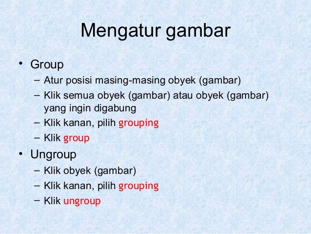- 23. Mengatur gambar • Group – Atur posisi masing-masing obyek (gambar) – Klik semua obyek (gambar) atau obyek (gambar) yang ingin digabung – Klik kanan, pilih grouping – Klik group • Ungroup – Klik obyek (gambar) – Klik kanan, pilih grouping – Klik ungroup
