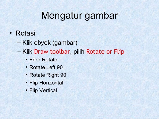 - 24. Mengatur gambar • Rotasi – Klik obyek (gambar) – Klik Draw toolbar, pilih Rotate or Flip • • • • • Free Rotate Rotate Left 90 Rotate Right 90 Flip Horizontal Flip Vertical