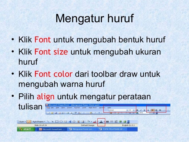 - 26. Mengatur huruf • Klik Font untuk mengubah bentuk huruf • Klik Font size untuk mengubah ukuran huruf • Klik Font color dari toolbar draw untuk mengubah warna huruf • Pilih align untuk mengatur perataan tulisan