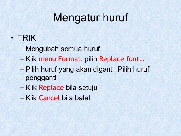 - 27. Mengatur huruf • TRIK – Mengubah semua huruf – Klik menu Format, pilih Replace font… – Pilih huruf yang akan diganti, Pilih huruf pengganti – Klik Replace bila setuju – Klik Cancel bila batal