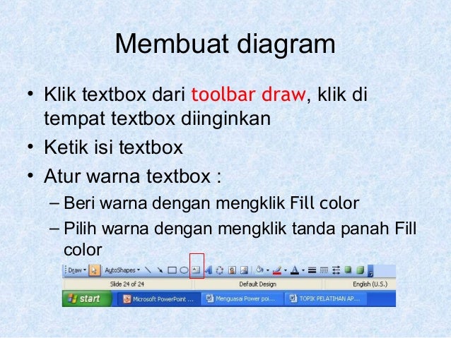 - 28. Membuat diagram • Klik textbox dari toolbar draw, klik di tempat textbox diinginkan • Ketik isi textbox • Atur warna textbox : – Beri warna dengan mengklik Fill color – Pilih warna dengan mengklik tanda panah Fill color