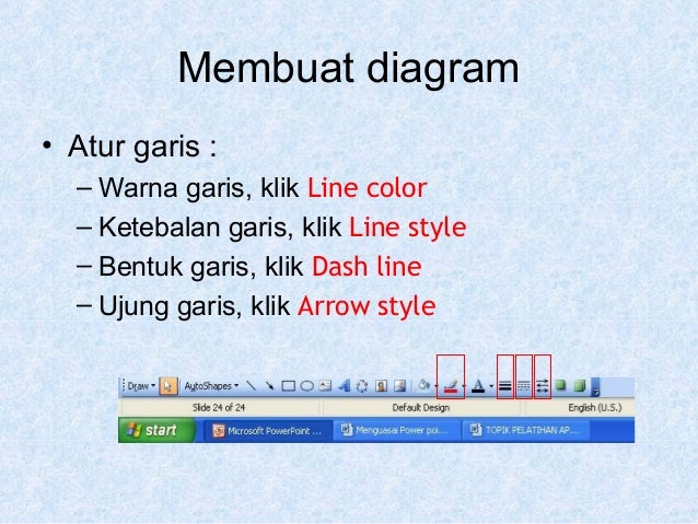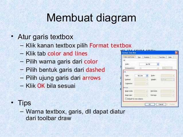 - 29. Membuat diagram • Atur garis textbox – – – – – – Klik kanan textbox pilih Format textbox Klik tab color and lines Pilih warna garis dari color Pilih bentuk garis dari dashed Pilih ujung garis dari arrows Klik OK bila sesuai • Tips – Warna textbox, garis, dll dapat diatur dari toolbar draw