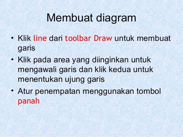- 30. Membuat diagram • Klik line dari toolbar Draw untuk membuat garis • Klik pada area yang diinginkan untuk mengawali garis dan klik kedua untuk menentukan ujung garis • Atur penempatan menggunakan tombol panah