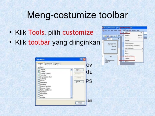 - 33. Meng-costumize toolbar • Klik Tools, pilih customize • Klik toolbar yang diinginkan