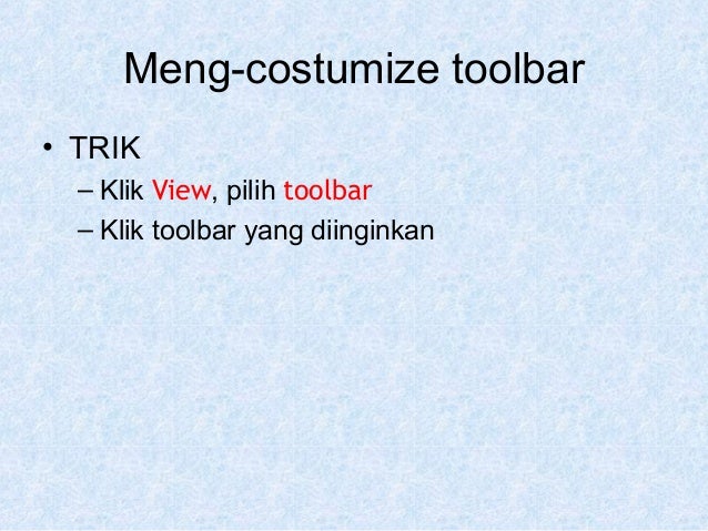 - 34. Meng-costumize toolbar • TRIK – Klik View, pilih toolbar – Klik toolbar yang diinginkan
