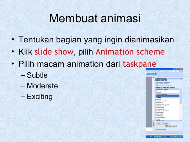 - 36. Membuat animasi • Tentukan bagian yang ingin dianimasikan • Klik slide show, pilih Animation scheme • Pilih macam animation dari taskpane – Subtle – Moderate – Exciting