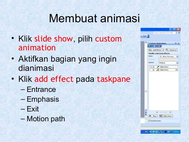 - 37. Membuat animasi • Klik slide show, pilih custom animation • Aktifkan bagian yang ingin dianimasi • Klik add effect pada taskpane – Entrance – Emphasis – Exit – Motion path