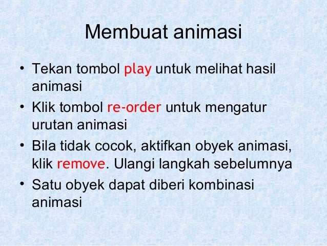 - 38. Membuat animasi • Tekan tombol play untuk melihat hasil animasi • Klik tombol re-order untuk mengatur urutan animasi • Bila tidak cocok, aktifkan obyek animasi, klik remove. Ulangi langkah sebelumnya • Satu obyek dapat diberi kombinasi animasi