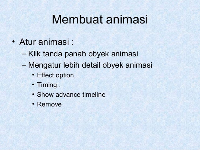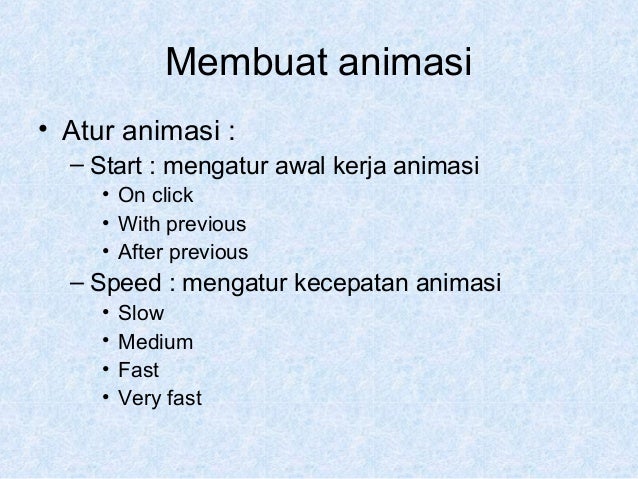 - 39. Membuat animasi • Atur animasi : – Start : mengatur awal kerja animasi • On click • With previous • After previous – Speed : mengatur kecepatan animasi • • • • Slow Medium Fast Very fast