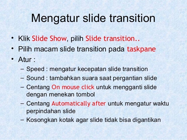 - 40. Mengatur slide transition • Klik Slide Show, pilih Slide transition.. • Pilih macam slide transition pada taskpane • Atur : – Speed : mengatur kecepatan slide transition – Sound : tambahkan suara saat pergantian slide – Centang On mouse click untuk mengganti slide dengan menekan tombol – Centang Automatically after untuk mengatur waktu perpindahan slide – Kosongkan kotak agar slide tidak bisa digantikan
