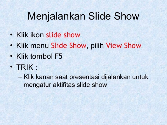 - 42. Menjalankan Slide Show • • • • Klik ikon slide show Klik menu Slide Show, pilih View Show Klik tombol F5 TRIK : – Klik kanan saat presentasi dijalankan untuk mengatur aktifitas slide show