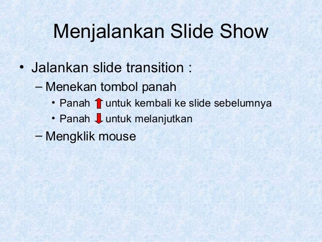 - 43. Menjalankan Slide Show • Jalankan slide transition : – Menekan tombol panah • Panah • Panah untuk kembali ke slide sebelumnya untuk melanjutkan – Mengklik mouse