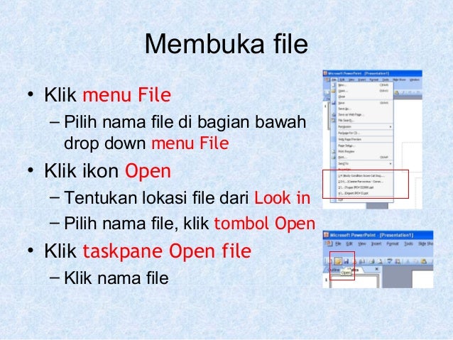 - 5. Membuka file • Klik menu File – Pilih nama file di bagian bawah drop down menu File • Klik ikon Open – Tentukan lokasi file dari Look in – Pilih nama file, klik tombol Open • Klik taskpane Open file – Klik nama file