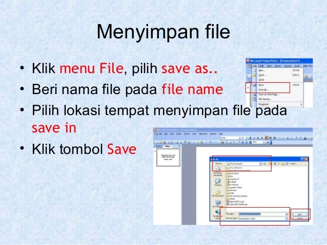 - 6. Menyimpan file • Klik menu File, pilih save as.. • Beri nama file pada file name • Pilih lokasi tempat menyimpan file pada save in • Klik tombol Save