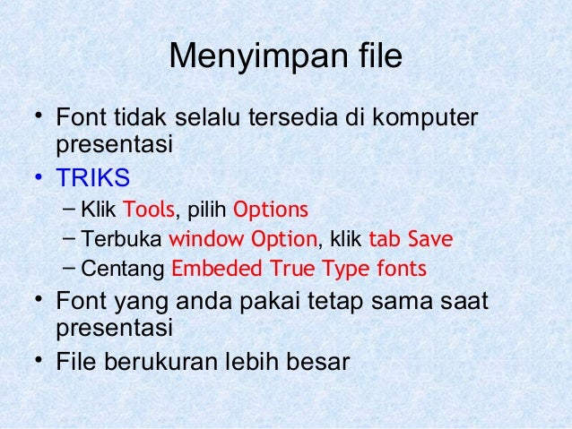 - 7. Menyimpan file • Font tidak selalu tersedia di komputer presentasi • TRIKS – Klik Tools, pilih Options – Terbuka window Option, klik tab Save – Centang Embeded True Type fonts • Font yang anda pakai tetap sama saat presentasi • File berukuran lebih besar
