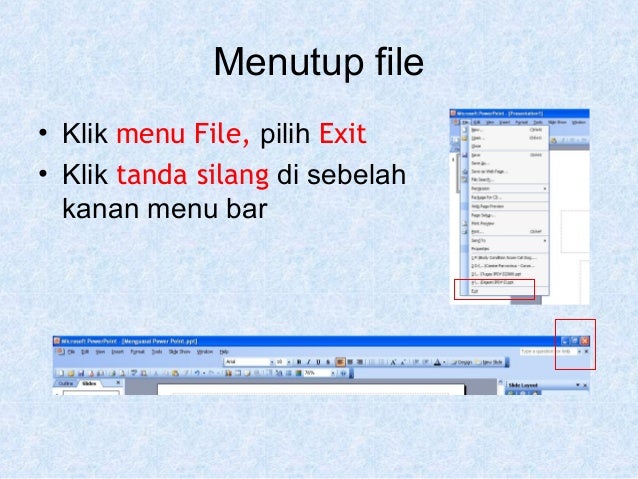 - 8. Menutup file • Klik menu File, pilih Exit • Klik tanda silang di sebelah kanan menu bar